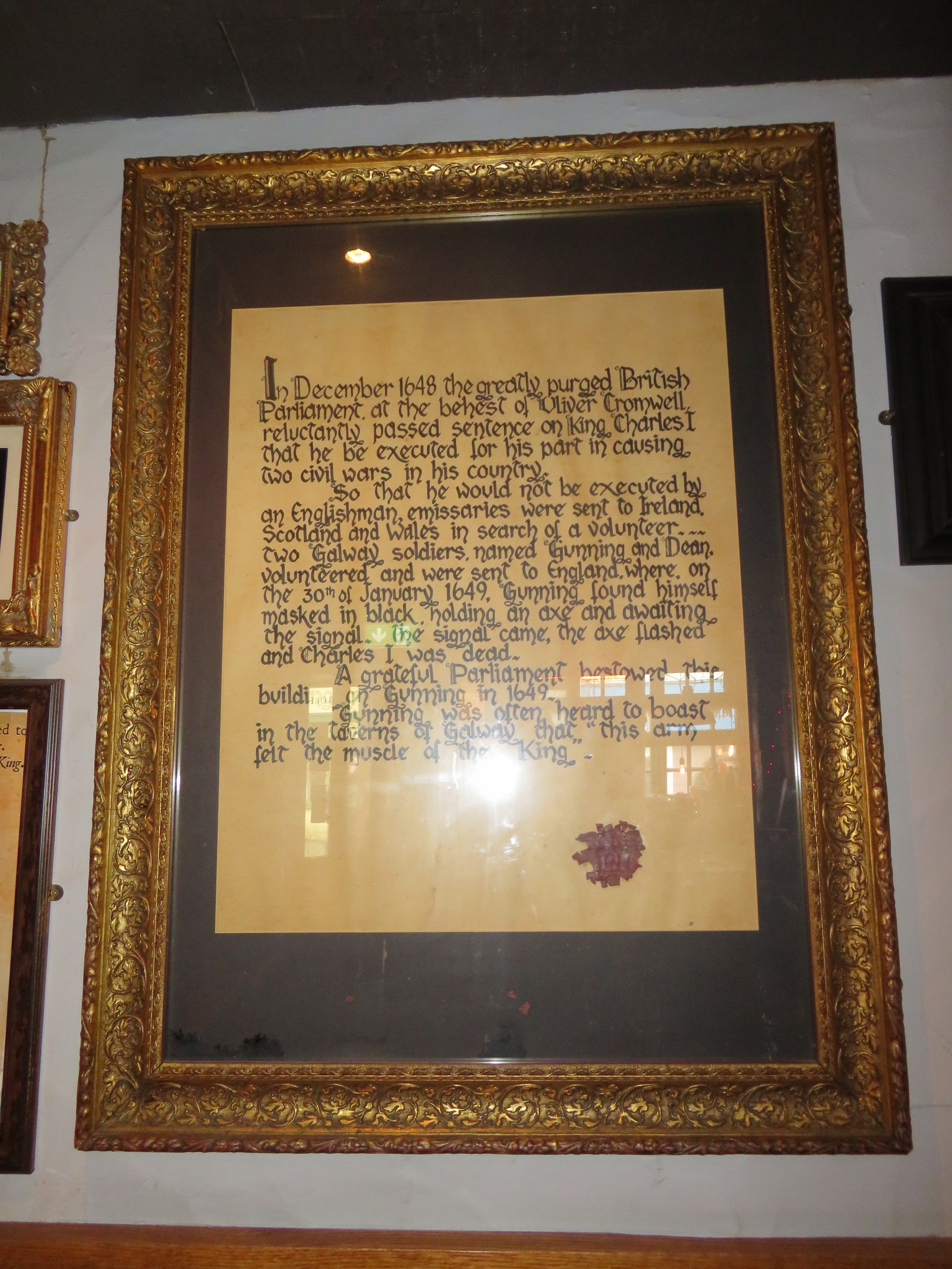 Legend has it that Richard Gunning was given a property in Galway in return for his role in the execution of King Charles I – ‘ the price of Royal Blood ‘. Gunning was heard to brag in the taverns of Galway that his hand had felt the muscles on the neck of the King of England.