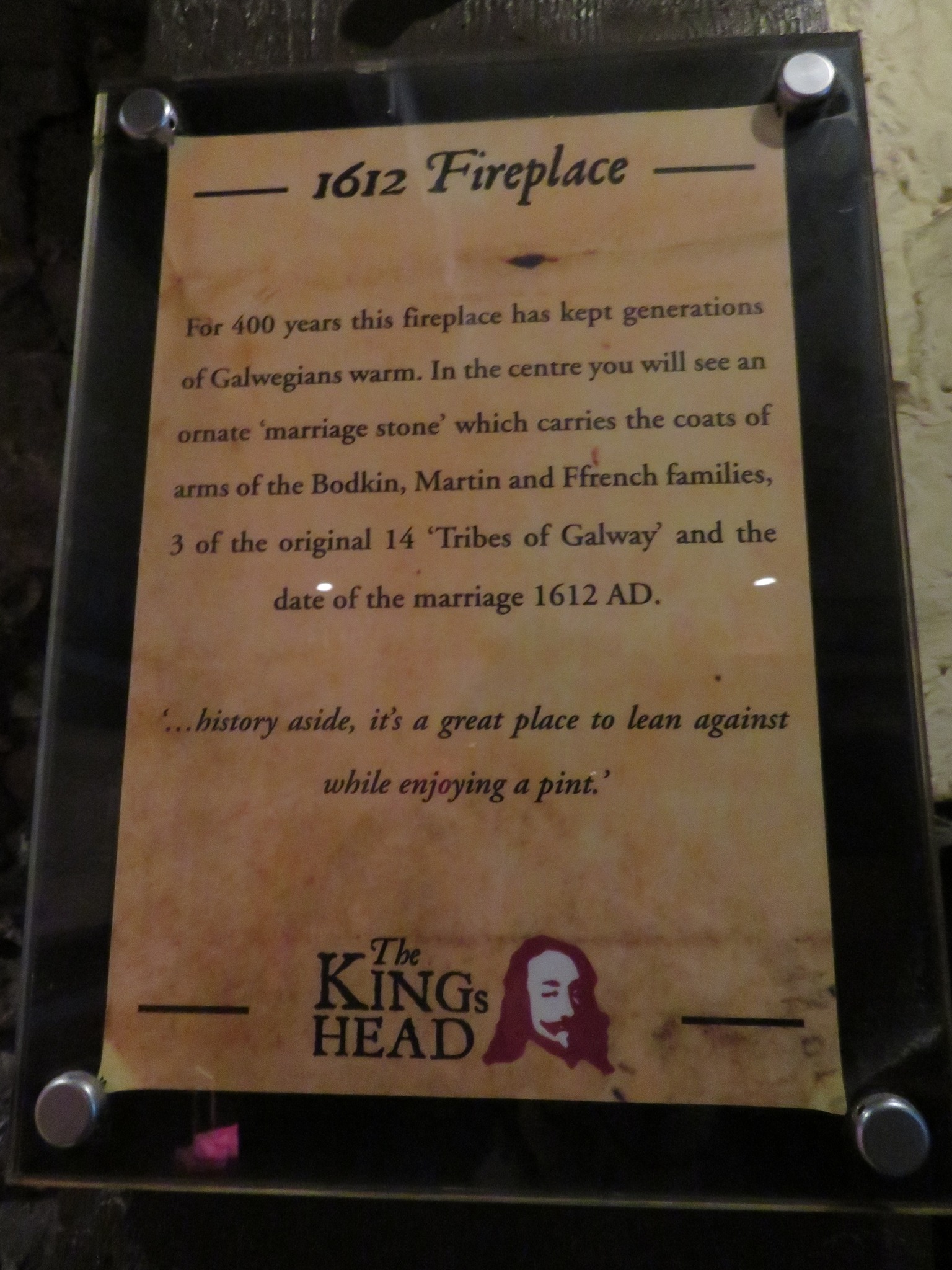 15 High Street is history on our doorstep. It brings us back over 800 years; for it was here that Stubbers took up residence. This building has several links to the Tribes of Galway, and is, in essence, a true piece of living history. Today, it is more commonly known as the ‘King’s Head’.